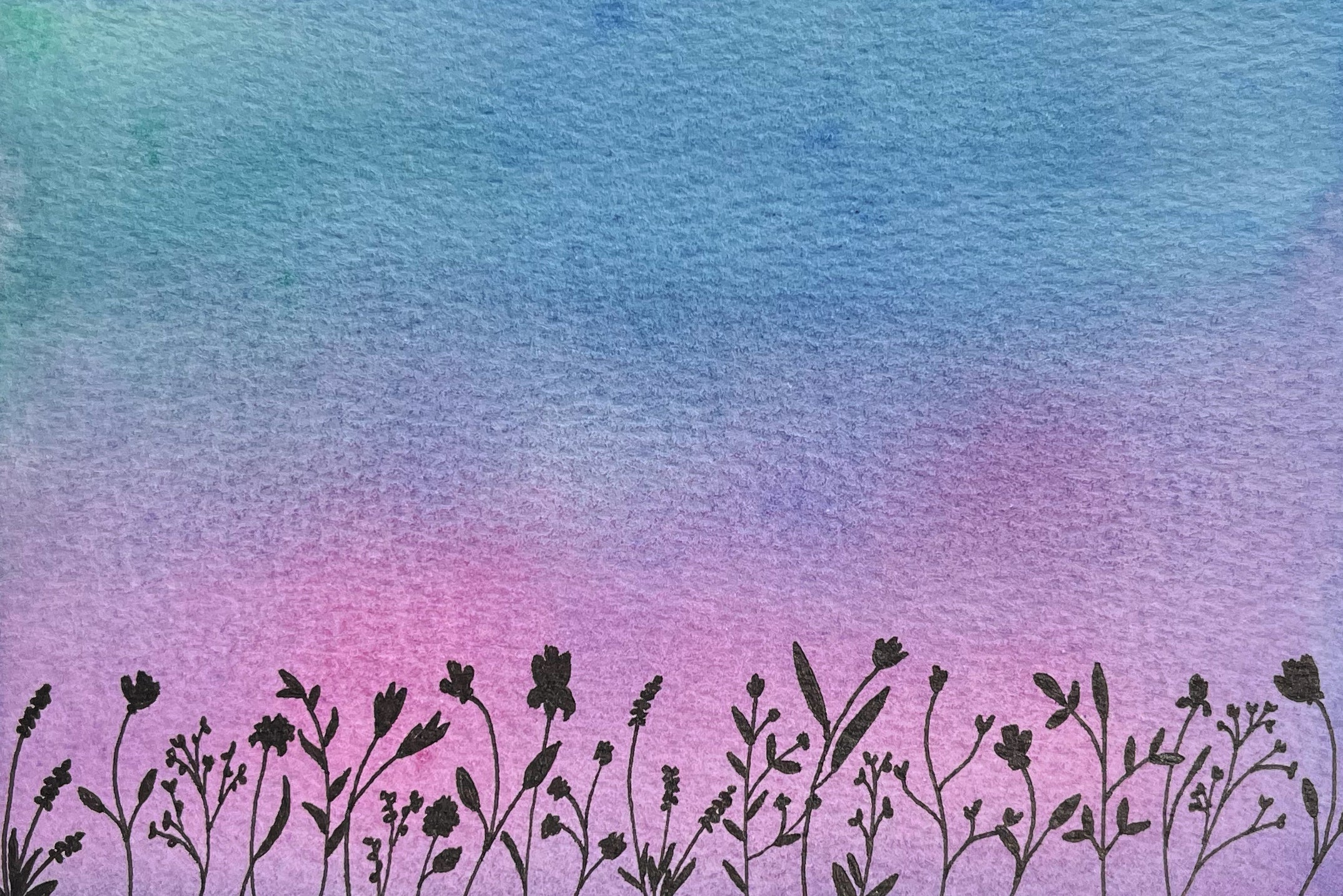 Bold pinks, purples, and blues created with watercolor form the background for the garden of ink drawn flowers